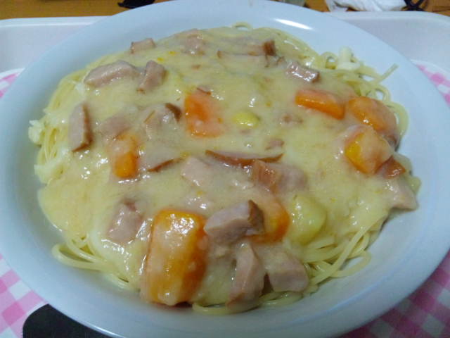 シチューをスパゲティーにかけて食べるのが好きです。