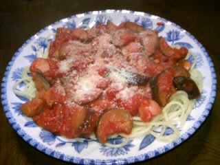 トマトソースにナスとウィンナーを加えました~。