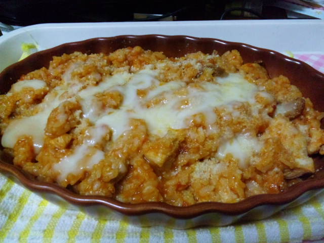 ナポリタンのソースに鶏肉を足してご飯と炒めてチーズ乗せて焼いて…。