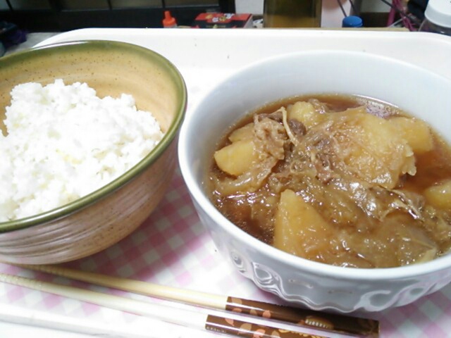 じゃがいもは昨日ほとんど食べっちゃって、多めに作ってた汁と肉な感じw