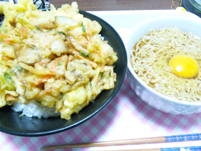 困った私はかき揚げ丼と月見ラーメンを作りました。